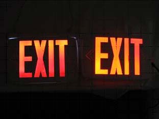 Limits of Growth (efficiency): How far state of the art products are from an Ideal LED signage lighting device??? (Sure you remember that any problem’s solution starts with asking an intelligent question). You wouldn’t find a definitive answer to this question in a sea of professional literature. One can consider a typical EXIT sign as an example. Our trade secret:: you do not have to buy our $50,000 Optical CAD/CAM KEREN software to find out an answer. Neither one should be a distinguished professor like most of our R&D; staff at Visus are. (One should just be a concerned individual with a vision and irresistible urge for innovation and betterment of the world we all live in.) My pocket calculator tells that one lumen is required to produce a standardized lambertian (equal in all hemispherical directions) luminance of 15 nits. Since our sign is observed only from the lower quadrant (as in most cases there is no human observers hanging over a ceiling) this figure can be reduced by half to 0.5 lm. Now a tiny 0.3 mm thick low cost ($0.03 - 0.05) 65mW color LED has 1.5 lumens with best white LEDs emitting 7.5 lm. Let us be not overoptimistic: there are some irreducible losses, in particular, if we want to keep the costs low. Assume an overall output efficiency of 70%.
